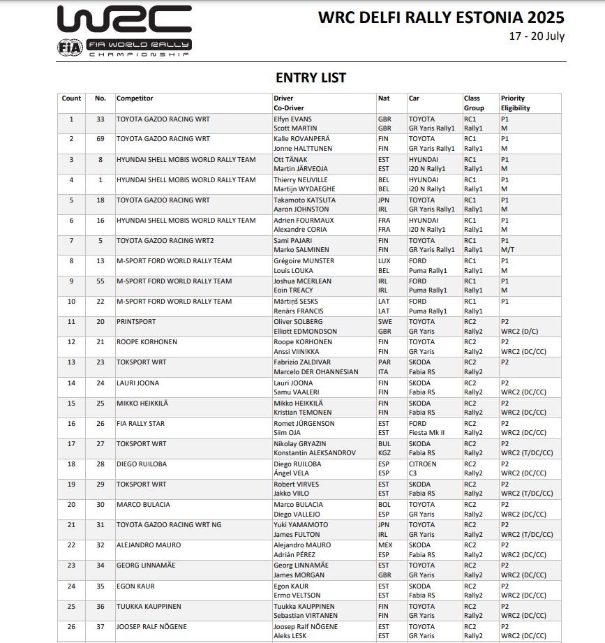 Ο Παγκόσμιος Πρωταθλητής Thierry Neuville (Hyundai i20 Rally1) ψάχνει την πρώτη του φετινή νίκη, που δύσκολα θα έρθει στην Εσθονία, με τους υπόλοιπους νεαρούς οδηγούς της Toyota να ρίχνονται στη μάχη με ιδιαίτερες αξιώσεις. Οι Takamoto Katsuta (Toyota Yaris Rally1) και Sami Pajari (Toyota Yaris Rally1) “βλέπουν” βάθρο, ενώ ο Oliver Solberg στην πρώτη του συμμετοχή στη μεγάλη κατηγορία μετά από καιρό, δεν θέλει να αφήσει την ευκαιρία να πάει χαμένη.