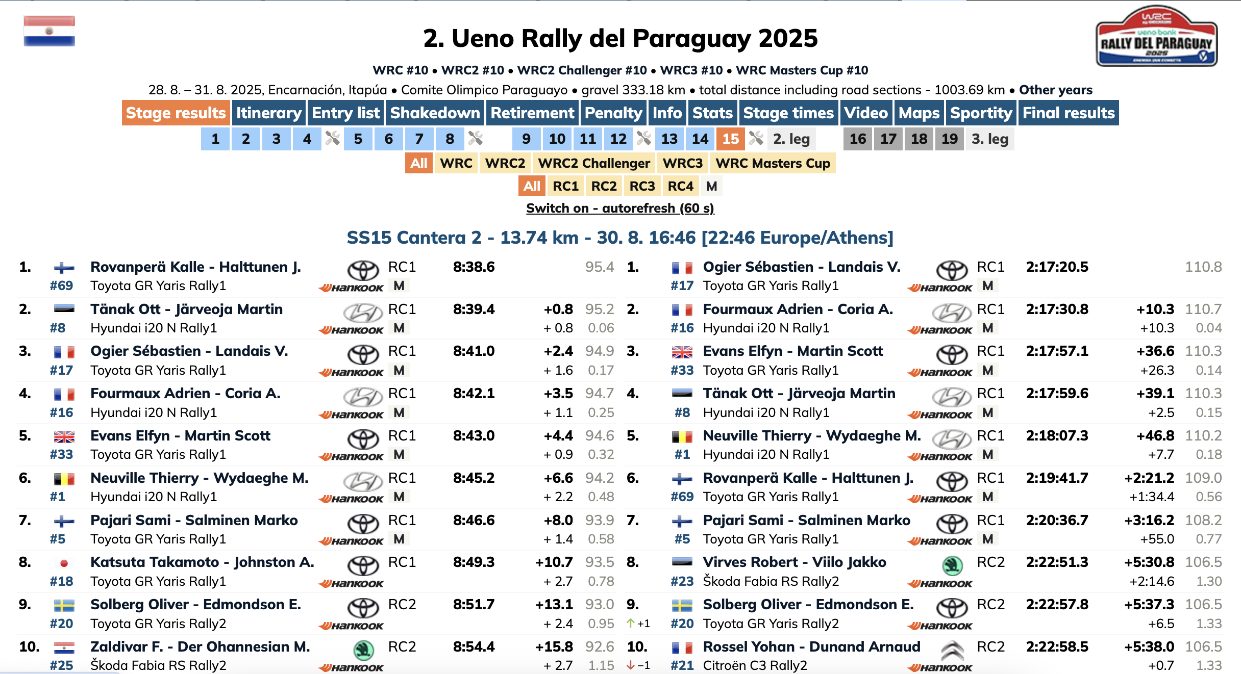 Ο Γάλλος πολυπρωταθλητής πίεσε στις ειδικές του δεύτερου σκέλους κερδίζοντας τέσσερις από αυτές και ανέβηκε στην κορυφή, με κυριότερο αντίπαλο του πλέον για την νίκη τον εκπληκτικό Adrien Fourmaux (Hyundai i20 Rally1) που δεν τα παρατάει. Δέκα δευτερόλεπτα τους χωρίζουν και αν λάβουμε υπόψη τα μέχρι τώρα δρώμενα, τίποτα δεν έχει τελειώσει.