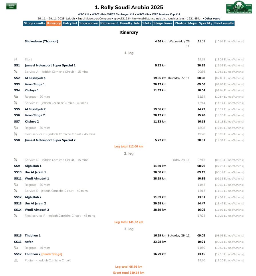 Το Ράλλυ Σαουδικής Αραβίας αποτελείται από 17 ειδικές διαδρομές και 320 αγωνιστικά χιλιόμετρα, ξεκινάει την Τετάρτη 26/11 το βράδυ με την υπερειδική και τερματίζει το Σάββατο 29/11 το μεσημέρι με την power stage του αγώνα. Μεγάλο ρόλο στην έκβαση του αποτελέσματος αναμένονται να παίξουν και τα κλαταρίσματα, σε έναν σκληρό αγώνα με πολλές πέτρες που απαιτεί εκτός από απόλυτη ταχύτητα και στρατηγική.